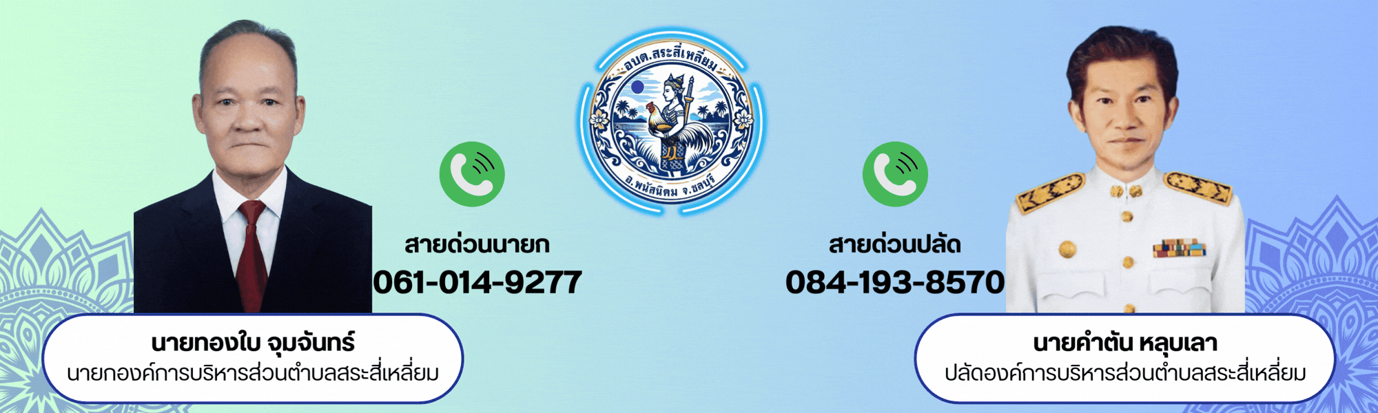 องค์การบริหารส่วนตำบลสระสี่เหลี่ยม ที่อยู่ : เลขที่ 99 หมู่ที่ 6 ตำบลสระสี่เหลี่ยม อำเภอพนัสนิคม จังหวัดชลบุรี 20140 โทร 038194001-2 , 0892035050 , 085-4880303